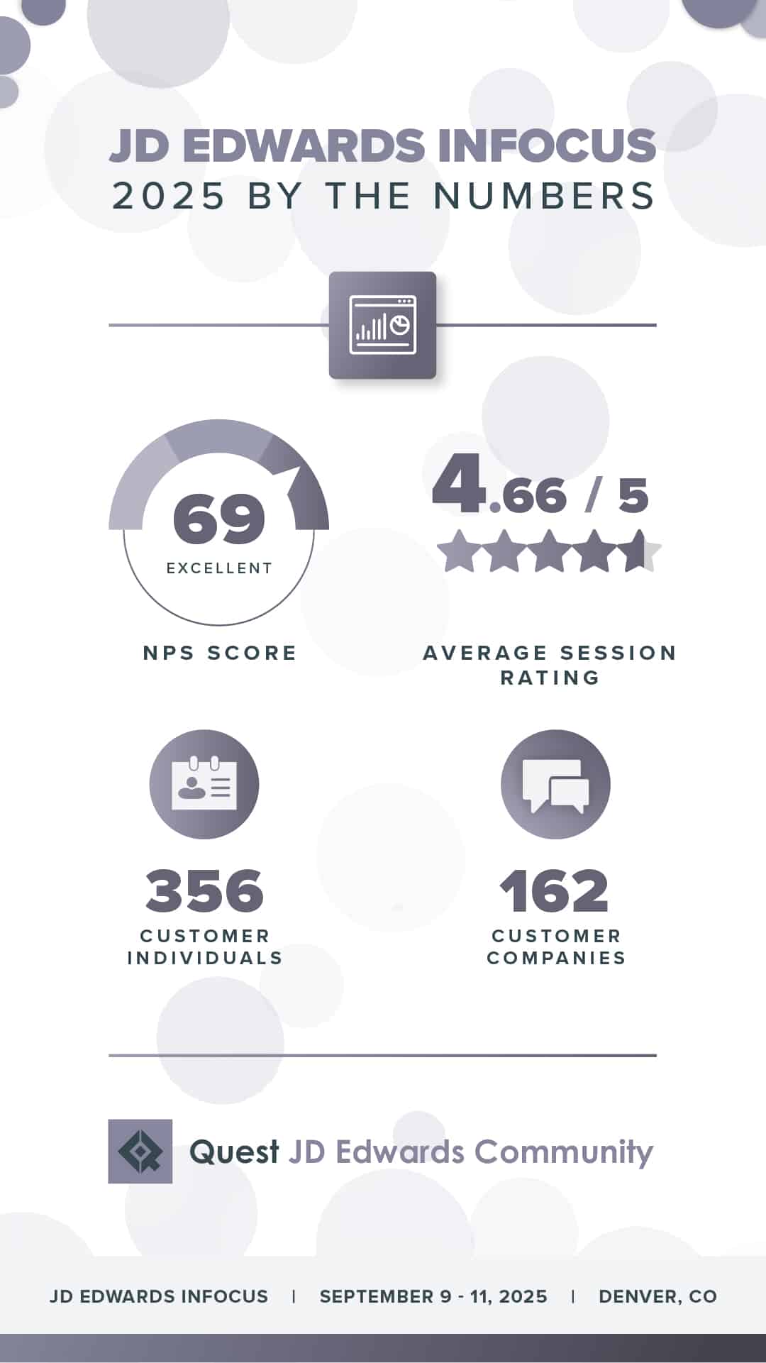 INFOCUS offers 3 jam-packed days of JD Edwards learning designed to keep you in the loop on JD Edwards updates and feature enhancements, with plenty of practical how-to learning. Flexible session formats let you build the agenda that best fits your schedule.