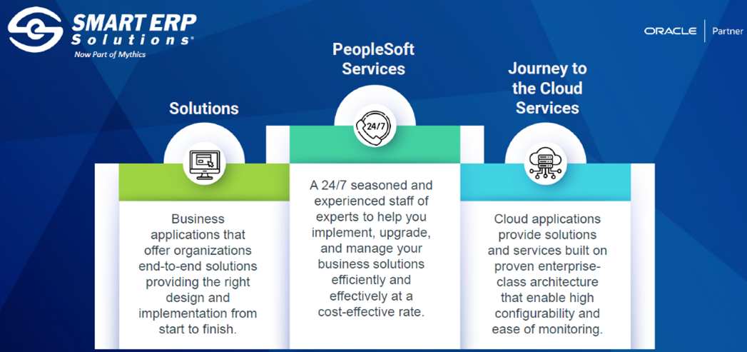 Recently, SmartERP joined forces with Mythics, a major Oracle partner, and SpearMC, a PeopleSoft consulting and training provider. Together, they operate as one PeopleSoft powerhouse offering: