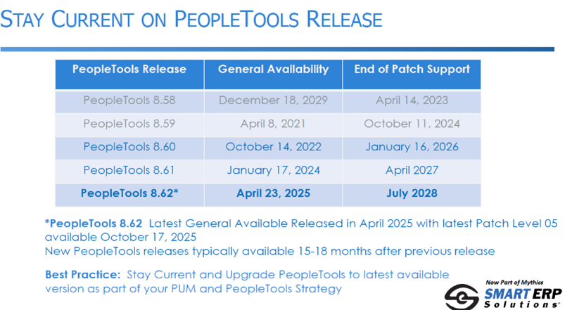 Selective adoption doesn’t work without a cadence. Some organizations alternate HCM and Financials each year; others keep both pillars current annually. The goal is a sustainable rhythm, not quarterly perfection. - Maintain Current PeopleTools Versions
