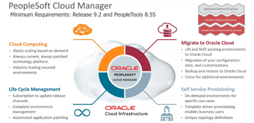Customers who migrate to OCI gain access to PeopleSoft Cloud Manager, which automates: