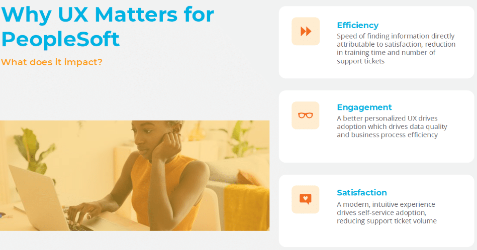 Chuck opened by framing user experience as a business issue, not just a design nice-to-have. Better UX in PeopleSoft translates directly to: