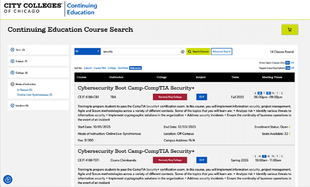 From search results, users see course details, schedules, and whether seats are available, and can add items to a cart.