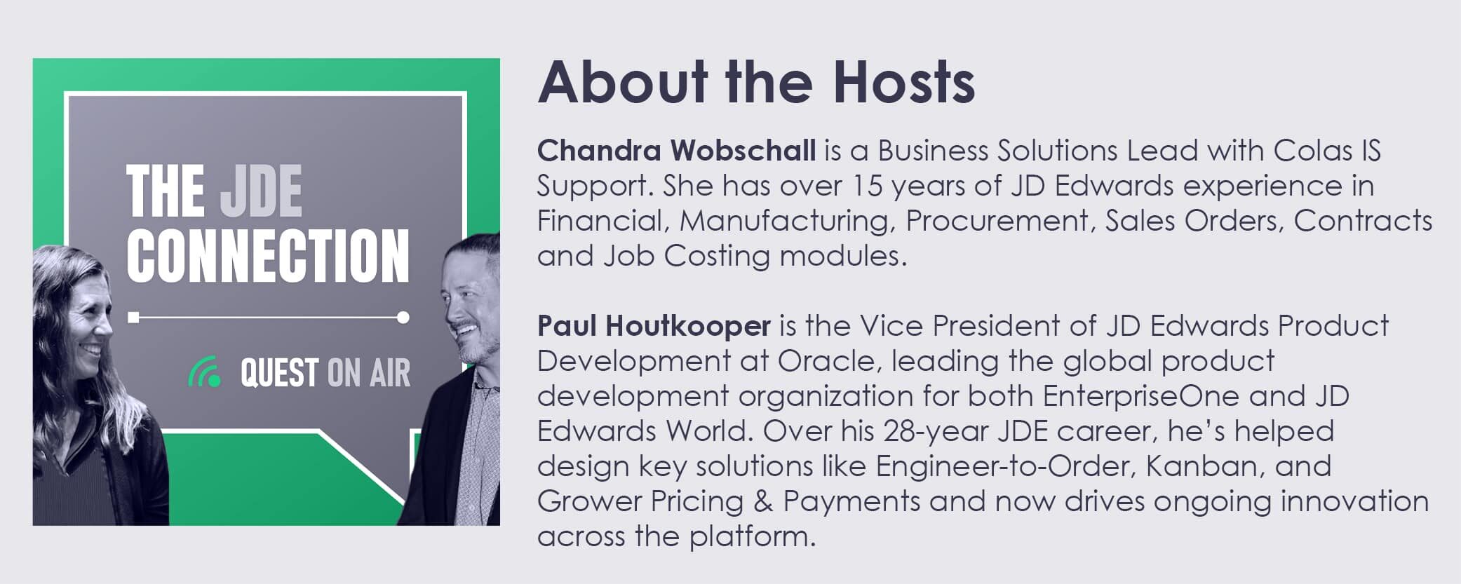In this special Thanksgiving episode, Chandra and Paul pause their usual programming to express gratitude to their listeners, colleagues, and partners. The hosts exchange heartfelt thanks for each other’s contributions and creativity, acknowledge Oracle’s commitment to the JD Edwards product and its roadmap, and appreciate Quest and the production crew—including their editor—for making the podcast possible. Above all, they celebrate the supportive, collaborative JDE community, promising to continue sharing episodes that inspire, educate, and connect everyone in the ecosystem.