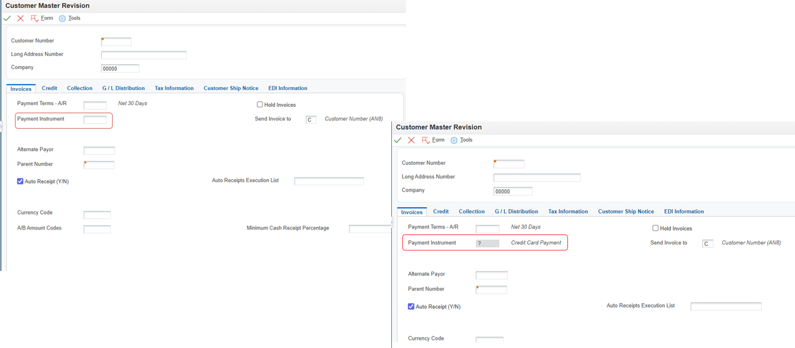Figure 3 – Customer Master Revision Before & After – Payment Instrument defaulted and disabled using LEX – no customization required.
